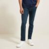 Mens Slim Jeans: Slim-fitting stretch jean features a low rise waist, slim fit in the thigh, and tapered leg that narrows below the knee and fits close at the ankle. Overall look is modern and well-suited for daytime wear and going out at night